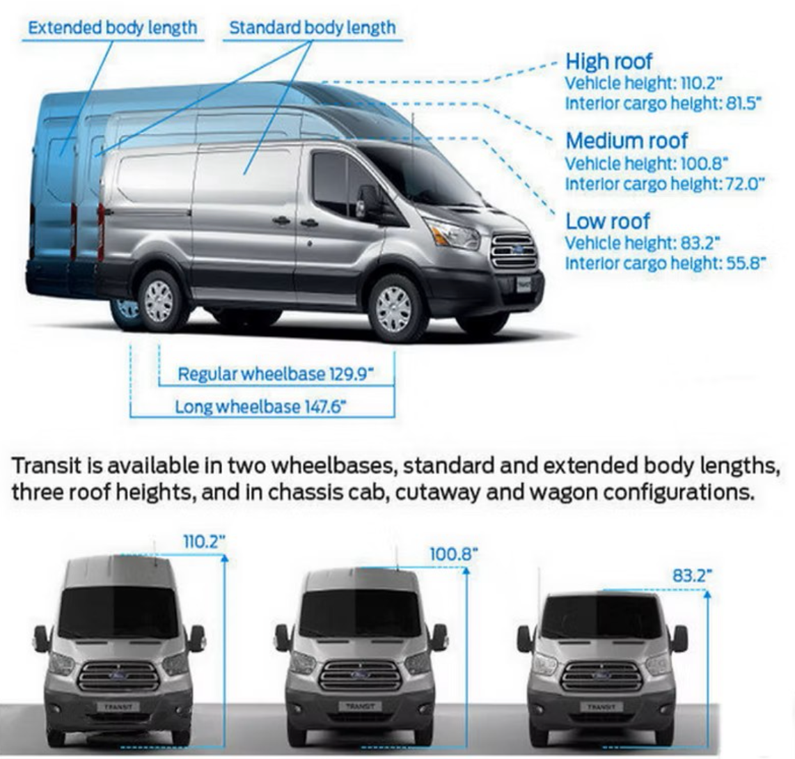 - Ford Transit 130 or 148 Wheelbase Low Roof